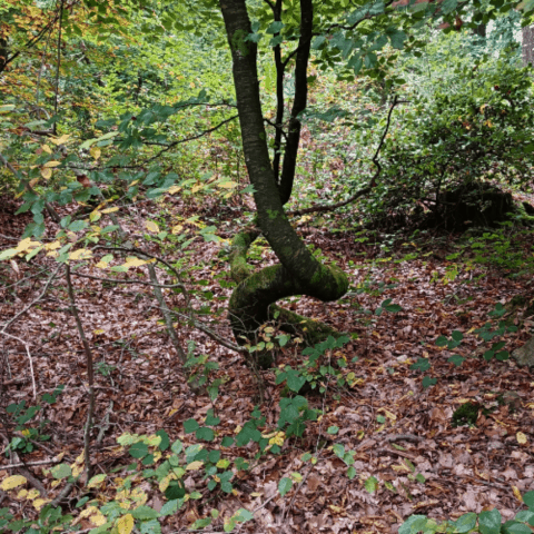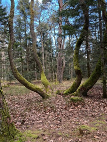 On détecte les veines d'eau souterraines avec une furcelle ou des baguettes parallèles. Ces zones sont souvent géopathogènes et les plantes ne s'y plaisent pas. Elles cherchent à s'en écarter. Parfois même elles ne survivent pas, comme ces thuyas qui se sont desséchés avec le temps.