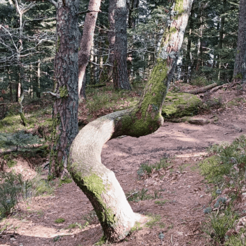 On détecte les veines d'eau souterraines avec une furcelle ou des baguettes parallèles. Ces zones sont souvent géopathogènes et les plantes ne s'y plaisent pas. Elles cherchent à s'en écarter. Parfois même elles ne survivent pas, comme ces thuyas qui se sont desséchés avec le temps.