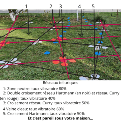On comprend par cette photo que tous les réseaux telluriques se croisent et se superposent. Leur impact parfois s'annule, mais souvent se cumule. Sur une très petite surface, on peut trouver côte à côte des points très positifs, régénérants, et d'autres très négatifs, perturbants, qu'il faut à tout prix éviter.
